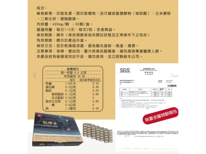 『鮫膠者』-鯊魚軟骨素+專利印度乳香 400mgX60粒 主要成分:鯊魚軟骨粉, 西印度櫻桃, 玻尿酸(流行鏈球菌發酵物), 印度乳香
